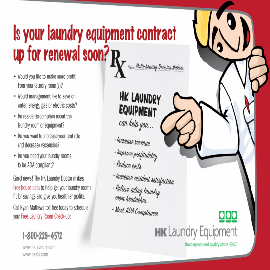 Management - The laundry room management option is where HK will install new laundry equipment, at no charge, to multi-housing customers and will maintain and service the equipment for the term of the agreement. HK will provide the landlord (or board) the option of a straight monthly compensation or a shared revenue compensation. Straight payment is sent out at the beginning of every month. The owner will receive a check automatically, just like clockwork. The shared revenue compensation is calculated and dispersed quarterly. In the calculations report is the collection date and the amount of each collection.
